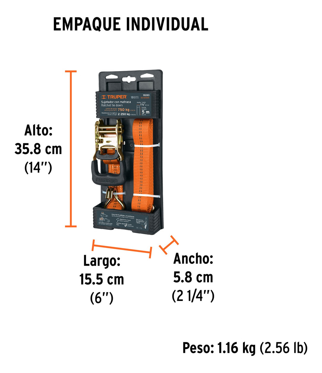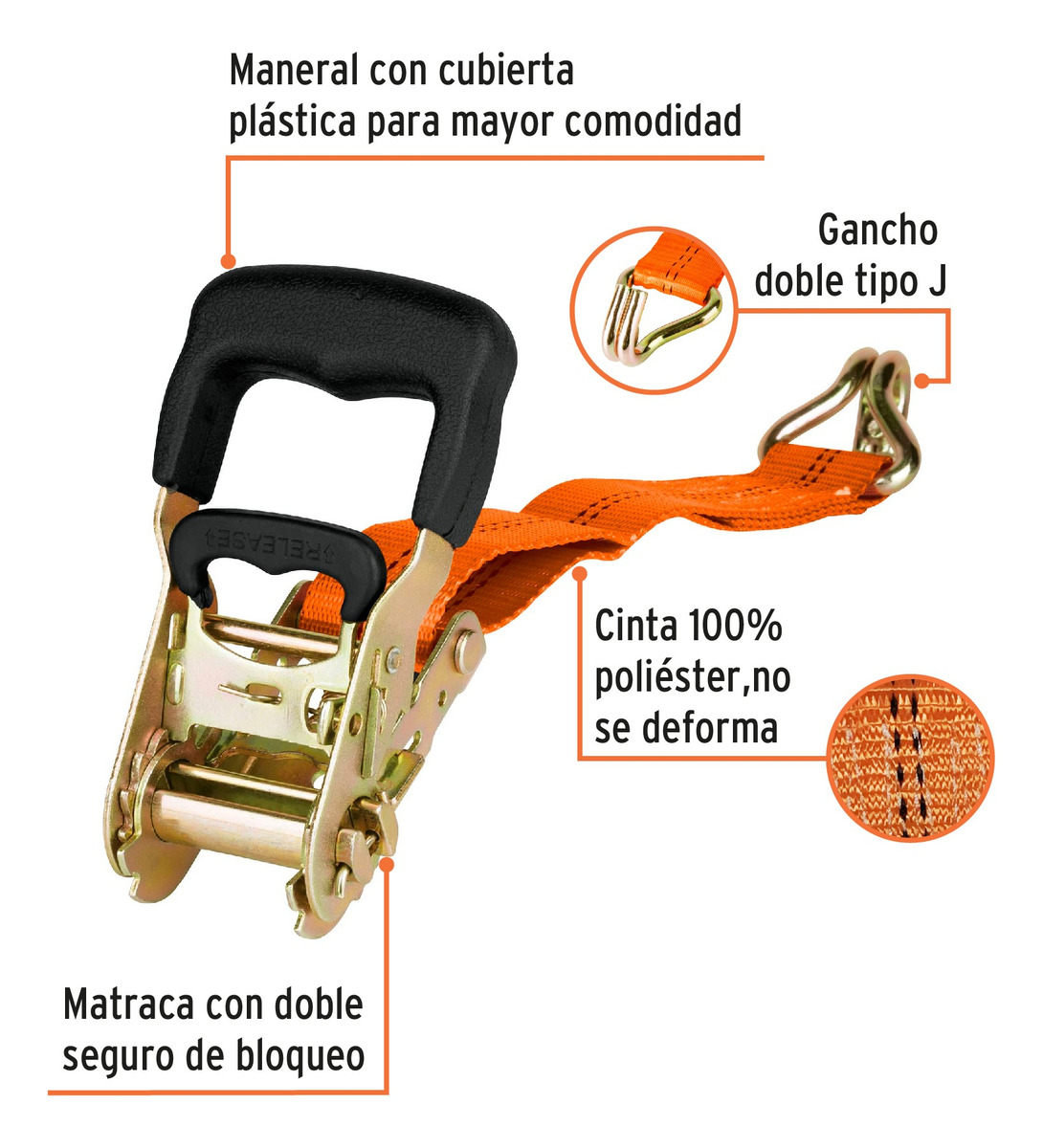 Asegura cargas de forma rápida y confiable. Además la matraca permite aplicar tensión controlada. También facilita liberación segura con su mecanismo.