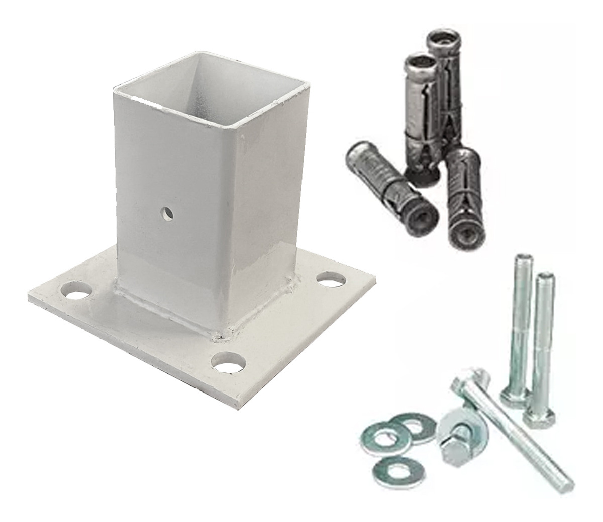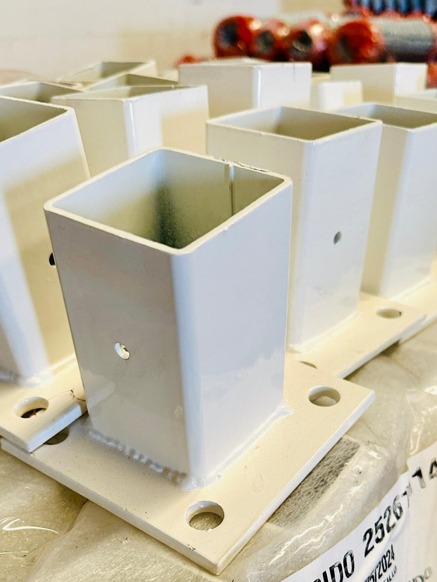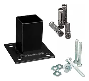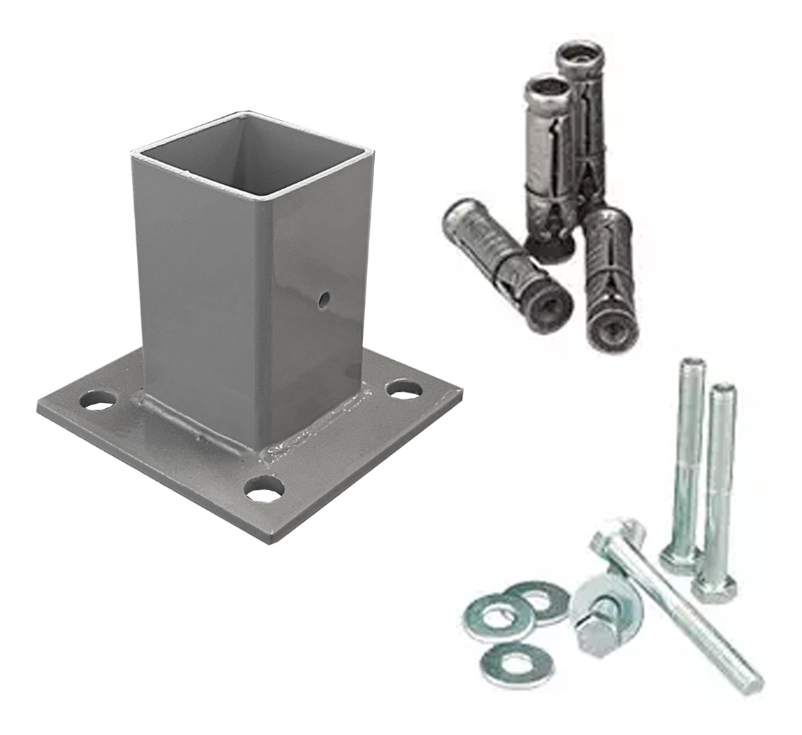 Producto nuevo en empaque individual. Incluye 1 base para poste de reja DeAcero con tornillo de fijación de 3/8 pulgadas.