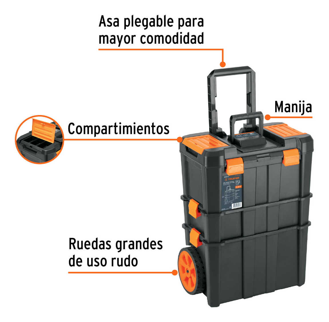 - Versatilidad 3 en 1: Incluye caja superior, sección intermedia y base rodante desmontables.
