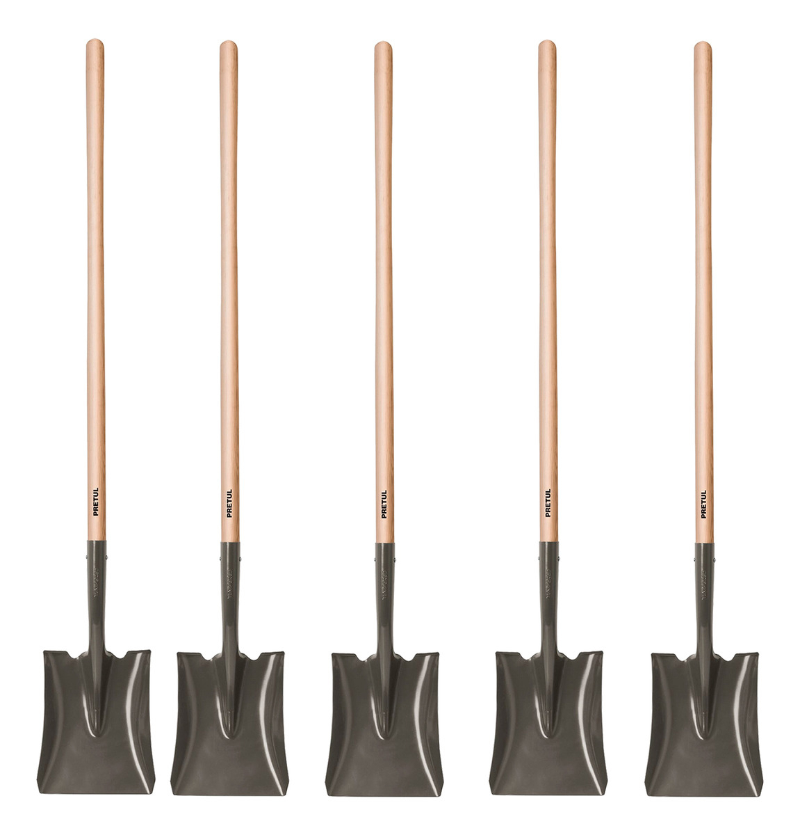 Incluye 5 palas cuadradas mango largo 44″ Pretul modelo PCD-L, listas para uso profesional en obra y jardinería.