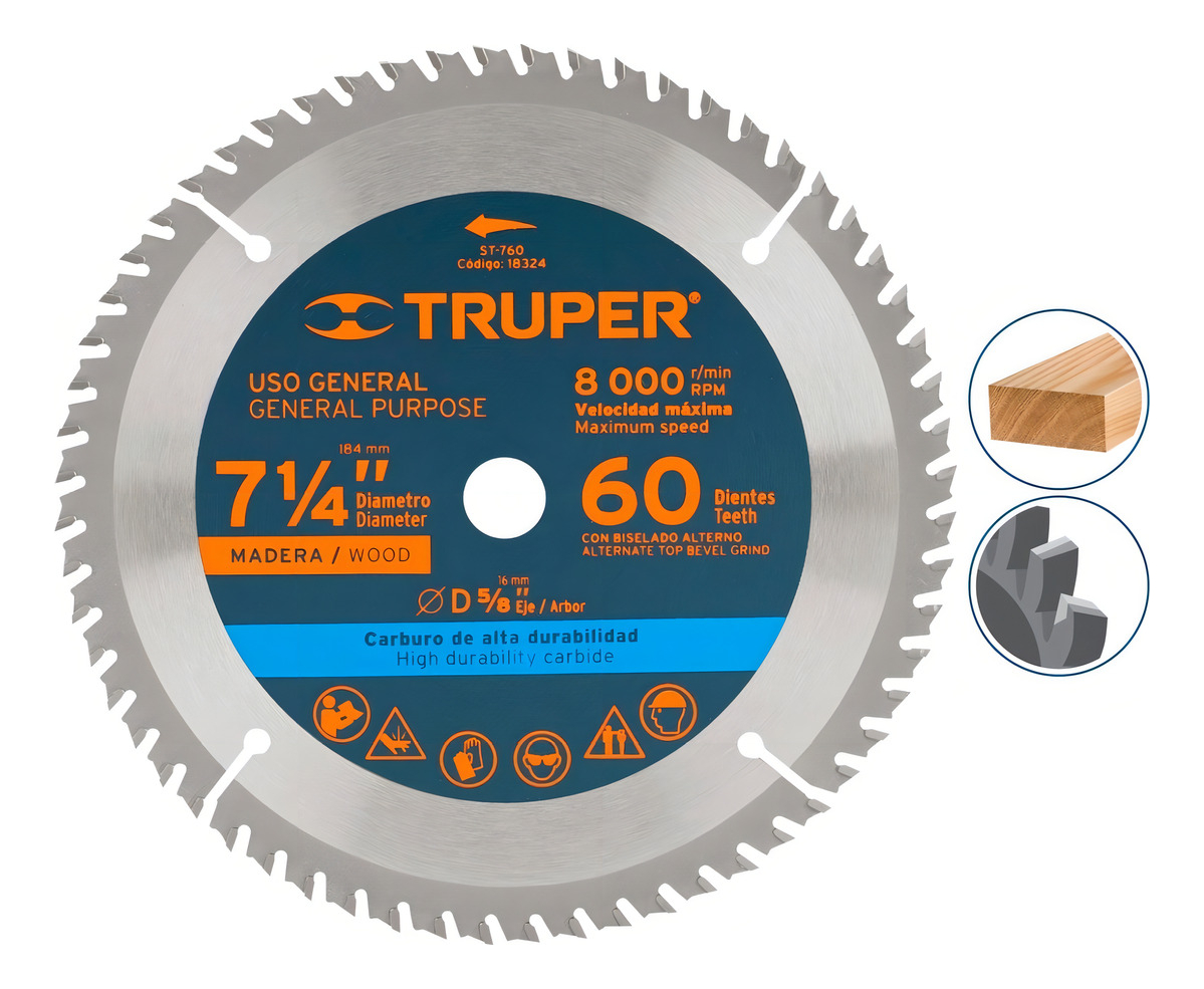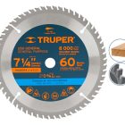 El disco para sierra circular Truper modelo 18324 de 7 1/4 pulgadas está diseñado para cortes finos y precisos en madera. Su configuración de 60 dientes mejora el acabado.