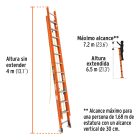 Diseñada para Uso Extra Pesado, esta escalera de 24 peldaños cuenta con una capacidad de carga de 175 kg. Con una altura extendida de 6.5 metros, permite un alcance máximo de trabajo de hasta 7.2 metros, convirtiéndola en el equipo estándar para instalaciones de alta tensión, servicios de telecomunicaciones y mantenimiento en naves industriales.