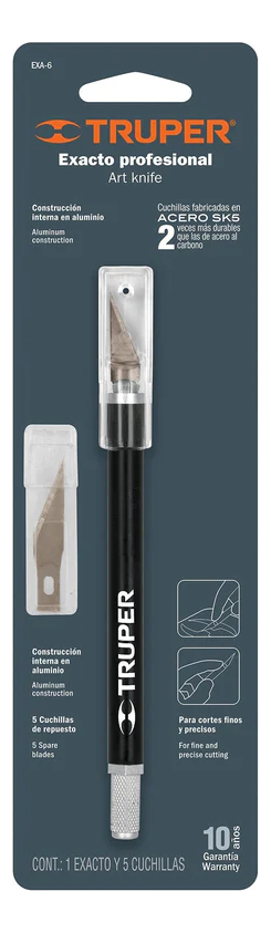 El Cutter Exacto Profesional Truper 6″ es la herramienta indispensable para quienes buscan cortes finos, precisos y seguros en una amplia variedad de materiales como papel, cartón, vinil, foamboard y otros materiales delgados. Su diseño ergonómico y ligero, junto con su cuerpo de aluminio texturizado, ofrece control máximo y comodidad durante trabajos prolongados, convirtiéndolo en la opción ideal para profesionales del diseño, estudiantes, manualistas y aficionados al bricolaje.