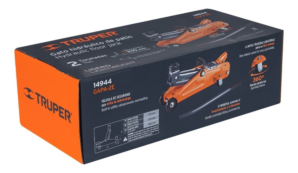 Con una capacidad de carga de 2 toneladas, este equipo permite levantar vehículos compactos y medianos con seguridad. Incorpora un sistema hidráulico de operación suave que facilita el levantamiento progresivo, mientras que el maneral controla tanto el ascenso como el descenso con precisión. Además, integra una válvula de seguridad que evita la sobrecarga, protegiendo al usuario y prolongando la vida útil del equipo.