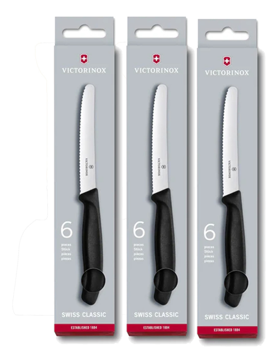 Este set se entrega en un empaque blister original que contiene 3 cuchillos de mesa y para tomate. Cada pieza cuenta con el icónico diseño de la línea Swiss Classic de Victorinox, con mangos ergonómicos fabricados en polipropileno de alta resistencia. Dependiendo de la edición, pueden presentarse en colores vibrantes o en el clásico color negro, listos para integrarse al servicio de mesa o a la estación de preparación de alimentos. Su tamaño compacto de 11 cm los hace extremadamente prácticos para el manejo diario.