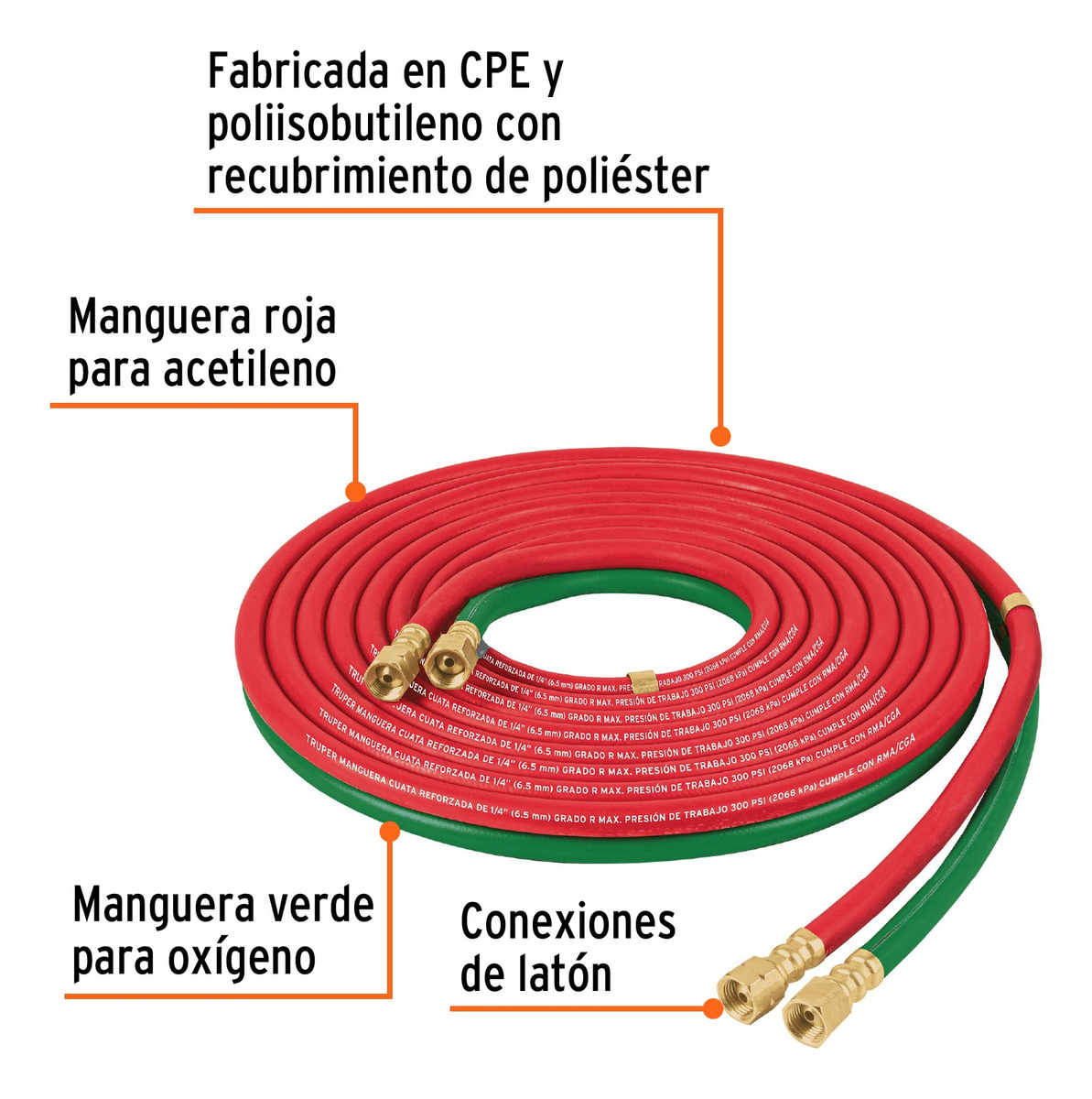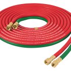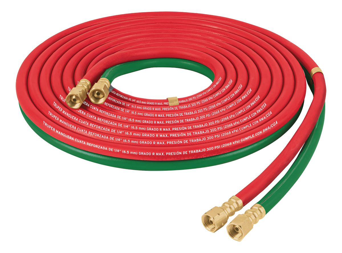 Manguera doble para oxígeno y acetileno diseñada para equipos de corte y soldadura. Permite conducir gases de forma segura en procesos de soldadura oxiacetilénica.