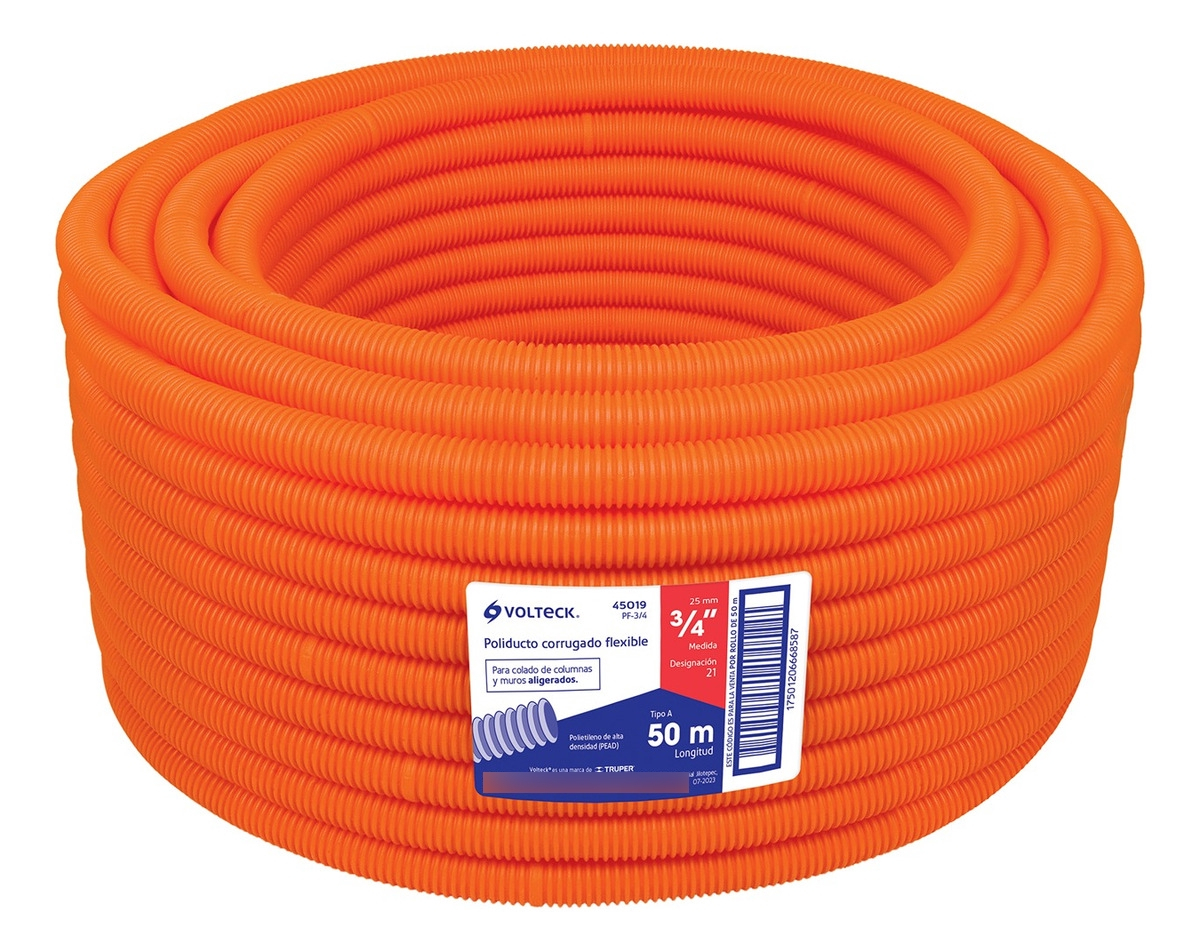 El poliducto corrugado flexible Volteck de 3/4 de pulgada es la solución estándar y confiable para la canalización segura de conductores eléctricos en cualquier tipo de obra. Su diseño corrugado permite una maniobrabilidad excepcional, facilitando el paso de cables a través de trayectorias complejas, esquinas o zonas estrechas donde la tubería rígida sería difícil de instalar. Fabricado bajo estrictos estándares de calidad, este ducto garantiza una protección duradera contra agentes externos, asegurando que la infraestructura eléctrica de residencias, comercios o naves industriales permanezca intacta y operativa por décadas.