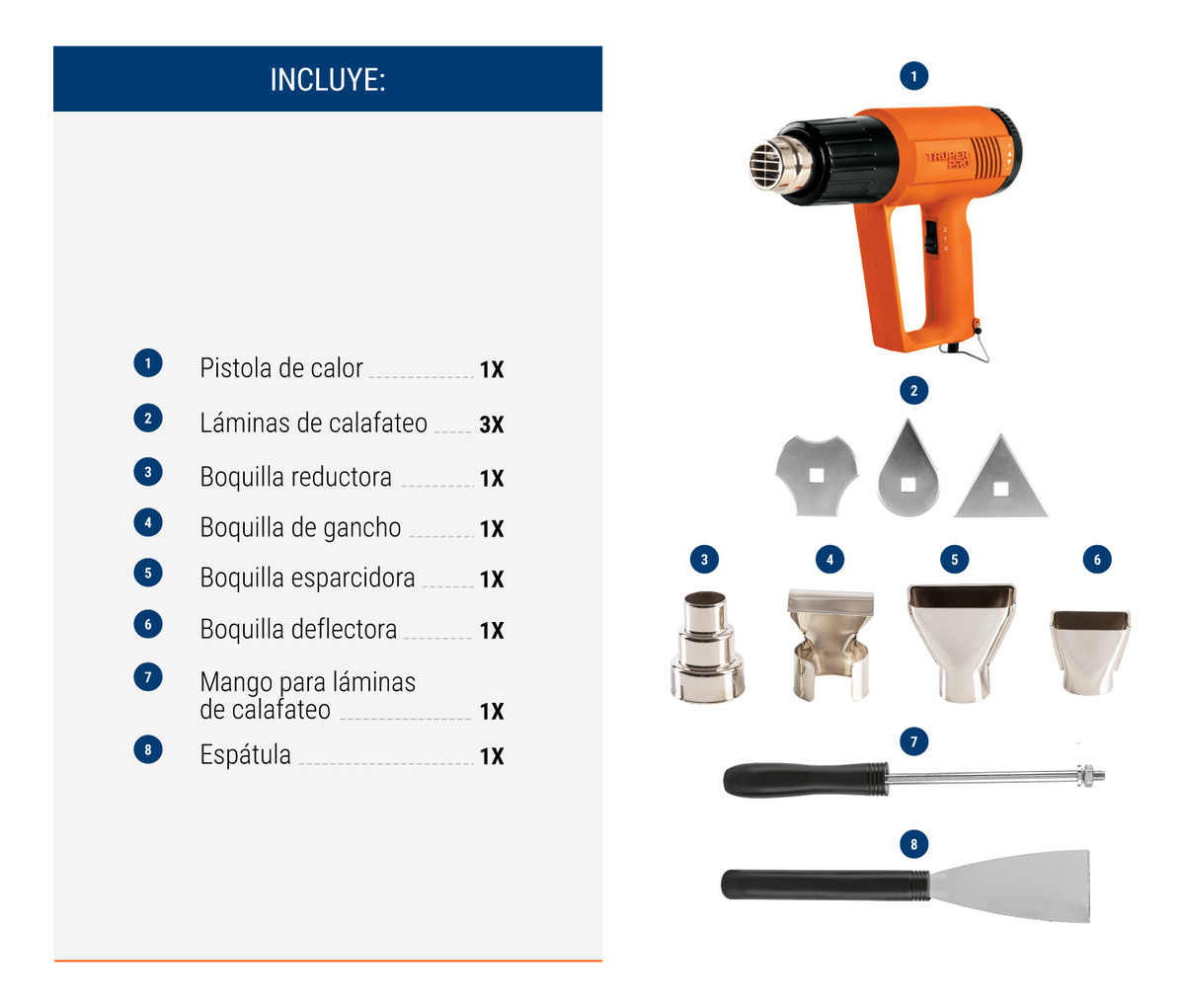 Este equipo se entrega en un estuche plástico de alto impacto con broches metálicos, diseñado para proteger la herramienta y organizar sus accesorios de forma eficiente. El kit es sumamente completo, incluyendo 4 boquillas intercambiables, una espátula y un juego de láminas de calafateo con mango. La pistola presenta un acabado profesional en color naranja, con un diseño que permite colocarla de forma vertical sobre su soporte de descanso para trabajar a manos libres o permitir un enfriamiento seguro tras su uso.