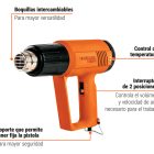 Fabricada con una carcasa de polímero termorresistente y componentes internos de alta durabilidad para soportar temperaturas extremas. Ofrece una potencia de 2,000 W con dos niveles de operación: el Nivel 1 alcanza hasta 200°C con un flujo de 500-600 L/min, mientras que el Nivel 2 llega hasta los 500°C con un flujo de 700-800 L/min. El ciclo de trabajo recomendado es de 30 minutos de uso por 15 de descanso. Pesa solo 1 kg, lo que facilita su manipulación prolongada sin fatiga. Funciona a una tensión de 127 V y cuenta con un sistema de enfriamiento optimizado para prolongar la vida útil de la resistencia interna.