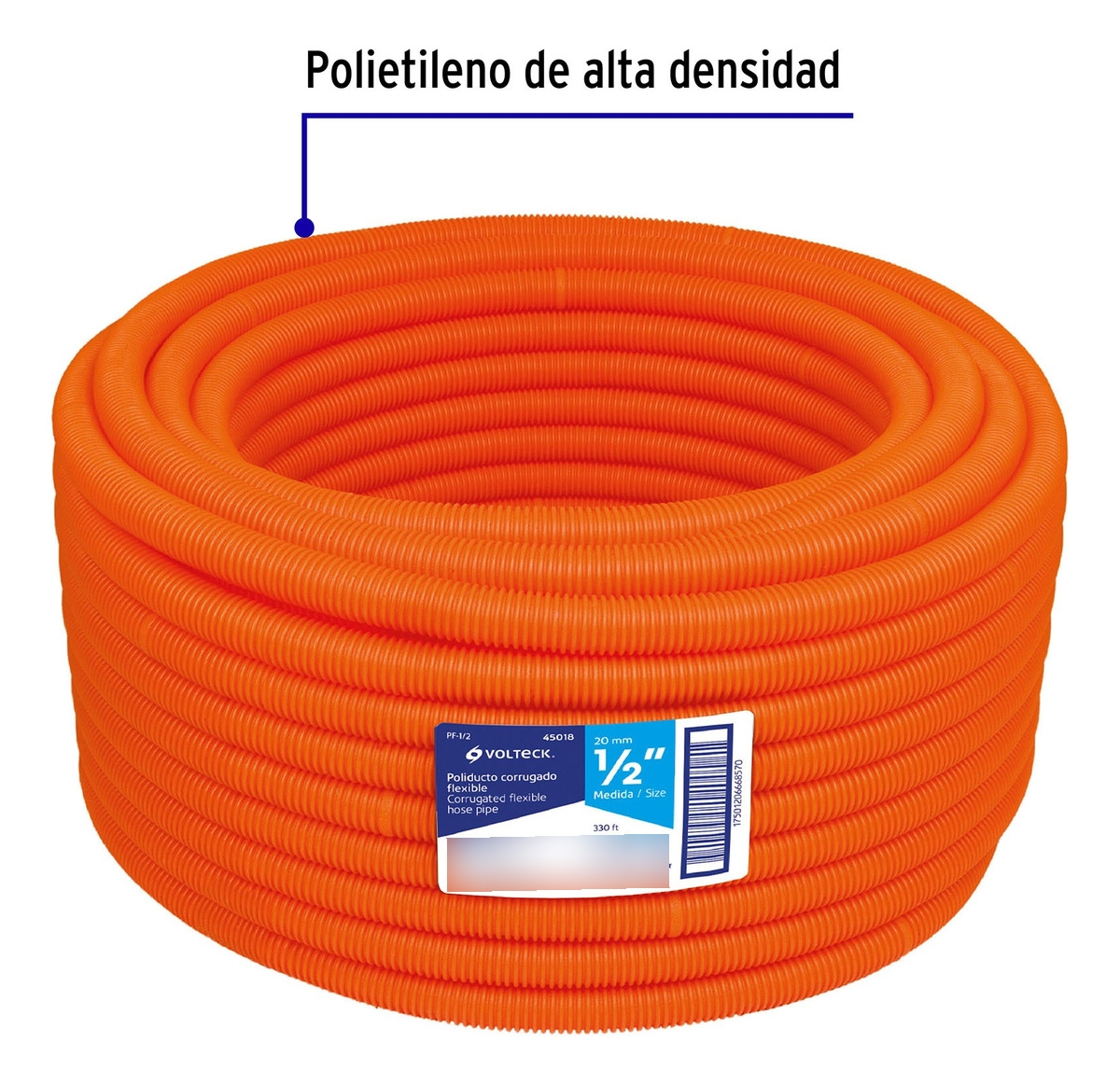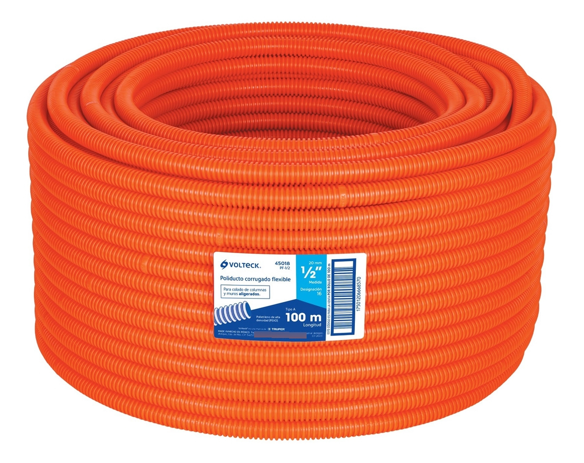 El poliducto corrugado flexible Volteck de 1/2 pulgada protege conductores eléctricos en instalaciones ocultas. Además, facilita el tendido en trayectorias con curvas.