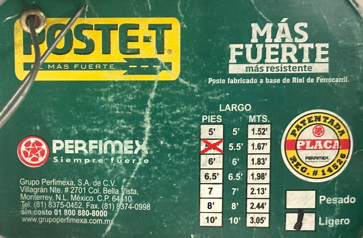Fabricados con acero de riel de ferrocarril reciclado de alta tenacidad, lo que les confiere una dureza superior a los postes de acero convencional. Cada poste tiene una longitud total de 1.68 metros (6 pies). Cuentan con un recubrimiento protector resistente a la intemperie y un ancla de placa de acero integrada en la base para una fijación firme en el suelo. El diseño incluye muescas o “tachones” a lo largo del cuerpo para facilitar el amarre del alambre de púas o malla ganadera sin que se deslice. Instalados con 30 cm bajo tierra, ofrecen una altura útil de 1.38 metros sobre el nivel del suelo.