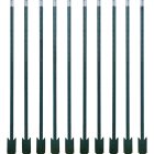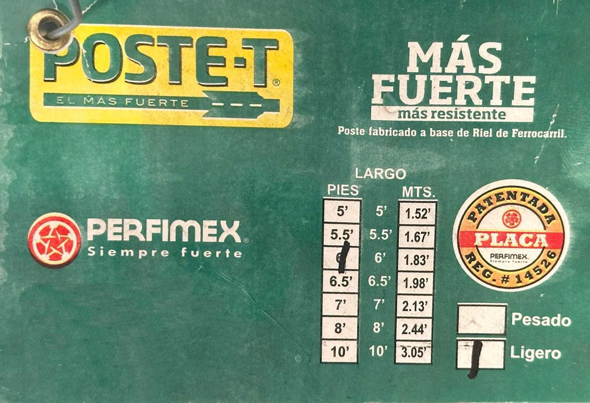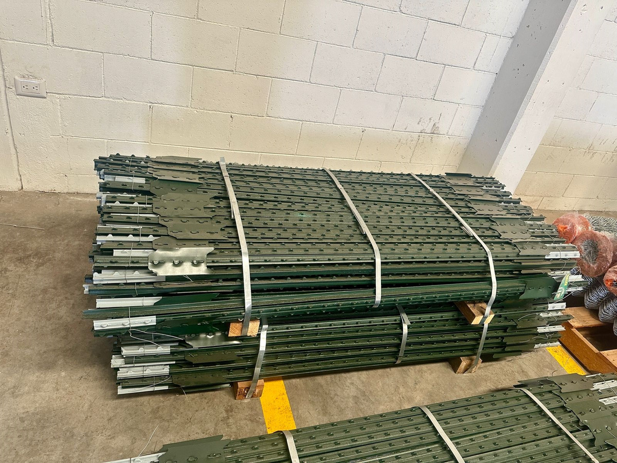 Este producto se entrega en un paquete de 10 unidades, lo cual es ideal para cubrir tramos largos de cercado. Cada poste tiene un acabado de pintura que lo protege contra la corrosión y la humedad del suelo. Incluye una placa de anclaje de acero soldada en la parte inferior para fijarse con fuerza a la tierra. Además, el cuerpo del poste cuenta con pestañas integradas que permiten sujetar el alambre de púas sin que se deslice. Se percibe como un material robusto, profesional y listo para hincarse directamente en el campo.
