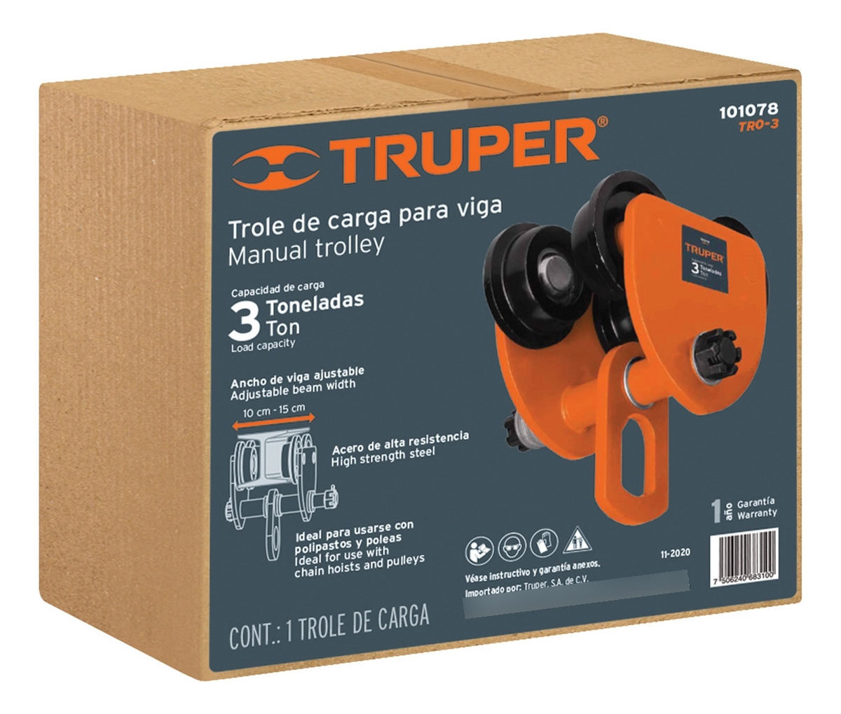 El trole de acero de 3 toneladas Truper TRO-3 es una solución confiable para el desplazamiento seguro de cargas pesadas en sistemas de izaje montados sobre vigas tipo IPR o IPS. Diseñado para uso industrial, este equipo permite mover materiales y maquinaria con suavidad y precisión, optimizando los procesos de trabajo en talleres, almacenes y obras de construcción.