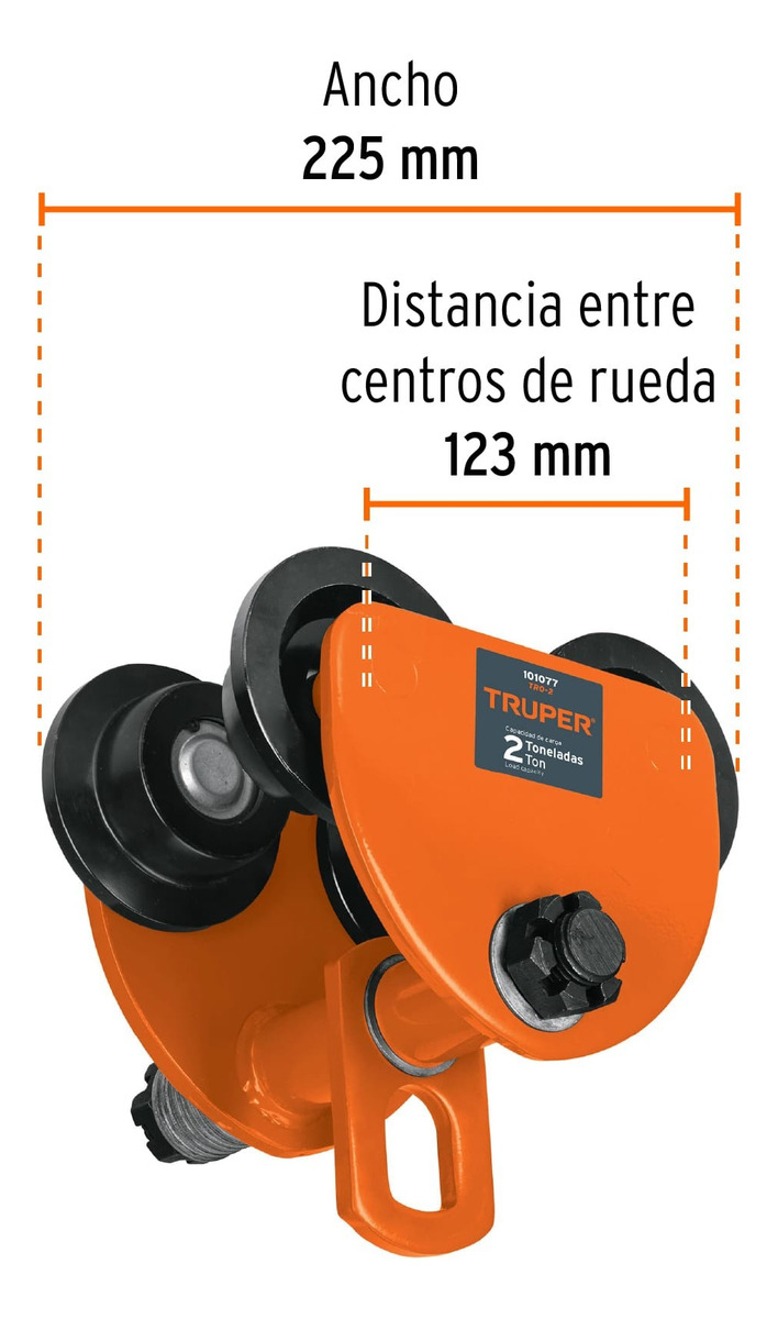 Fabricado en acero de alta resistencia, el trole está preparado para soportar cargas dinámicas bajo operación continua. Cuenta con ruedas de 102 mm × 40 mm con baleros, lo que reduce la fricción y permite un desplazamiento más uniforme incluso con carga máxima. El diámetro interno de rueda es de 75 mm, la distancia entre centros de ruedas es de 123 mm, y su ancho total es de 225 mm, elementos que contribuyen a mantener la estabilidad durante el movimiento. El perno de 30 mm de diámetro proporciona rigidez estructural al conjunto.
