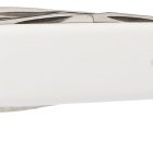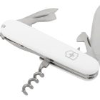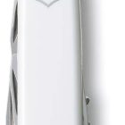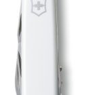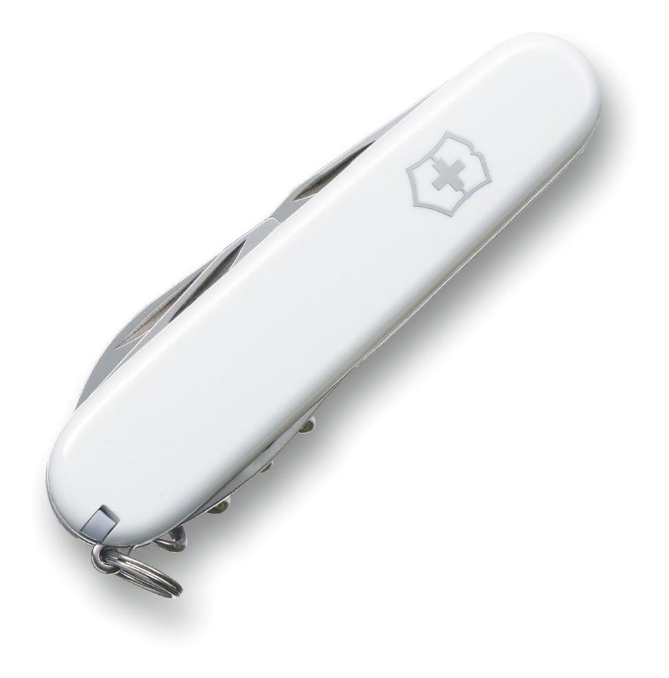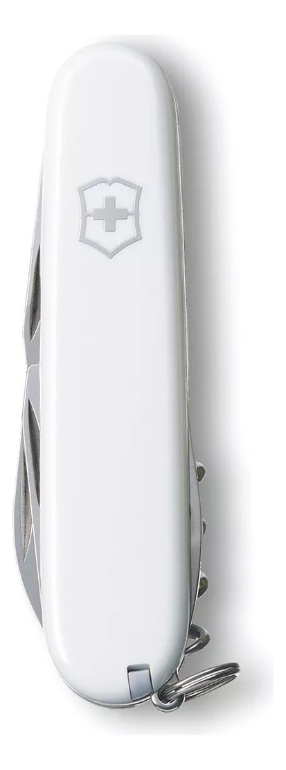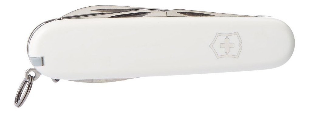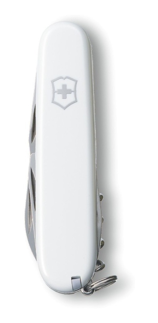 Las cachas están fabricadas en ABS/Cellidor de alta resistencia en un impecable color blanco pulido con el escudo Victorinox. Posee un tamaño de 91 mm y un peso ligero que facilita su transporte. Cuenta con 12 funciones esenciales: hoja grande, hoja pequeña, abrelatas, destornillador de 3 mm, destapador, destornillador de 6 mm, pela cables, punzón escariador, sacacorchos, palillo de dientes, pinzas y anilla. Todas las herramientas están fabricadas en acero inoxidable de alta calidad, diseñado para resistir la corrosión y mantener un desempeño óptimo por décadas.